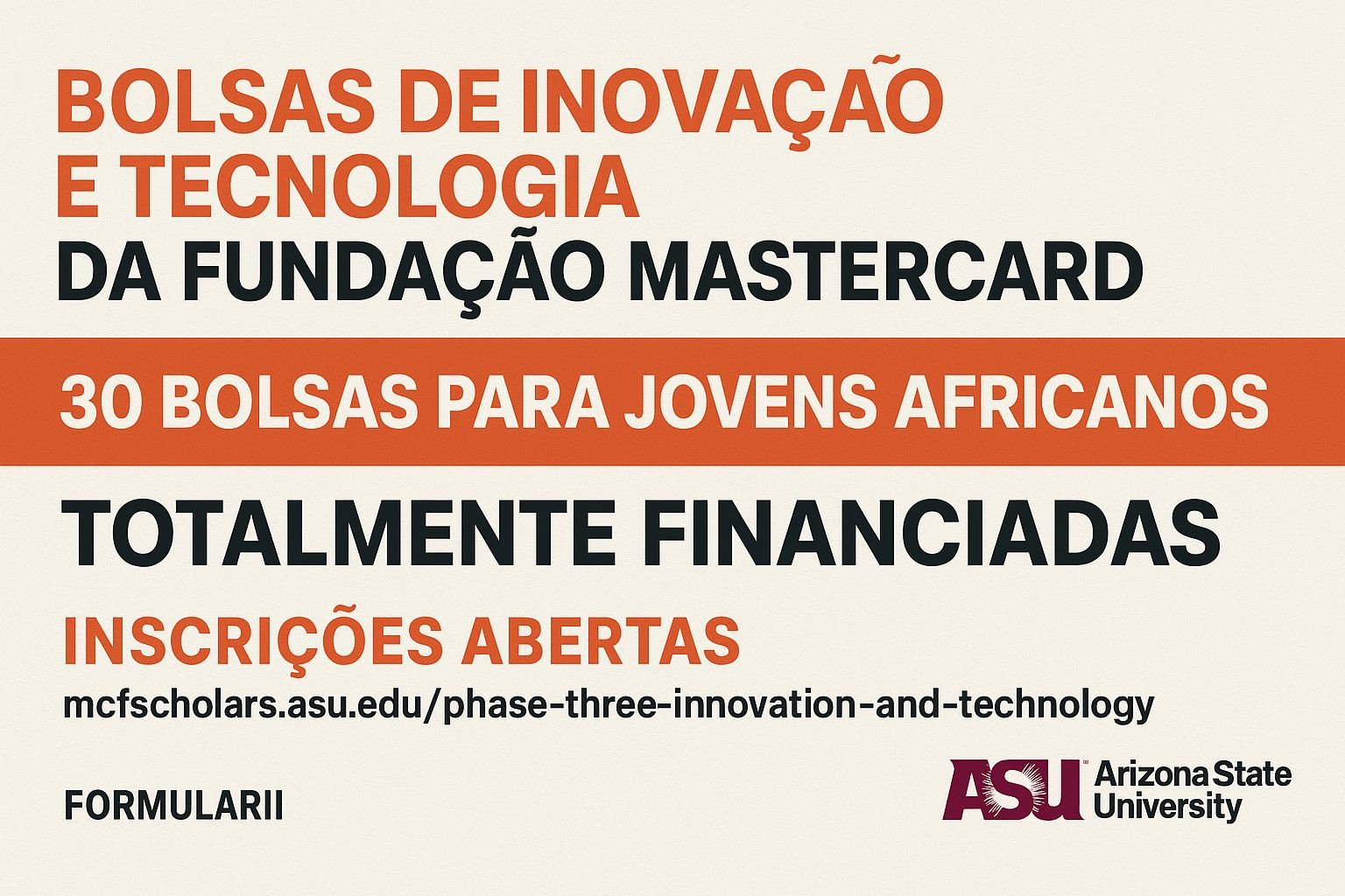 A Universidade Estadual do Arizona (ASU), em parceria com a Fundação Mastercard, anunciou a abertura das candidaturas para o Programa de Bolsas de Inovação e Tecnologia 2026, destinado a jovens profissionais africanos.